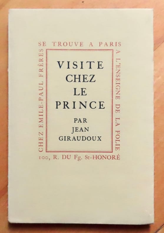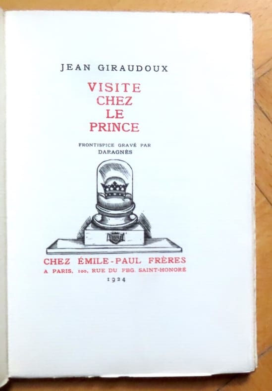 1924 GIRAUDOUX Jean : Visite chez le Prince. Emile-Paul Frères Paris 1924. E.O. L’un des ex. sur Vergé, troisième papier après 20 Japon et 75 Hollande. Complet du frontispice par DARAGNES. Reliure in-12 à la bradel plein papier orangé, dos lisse, pièce de titre sur cuir rouge, couvertures et dos conservés, intérieur frais