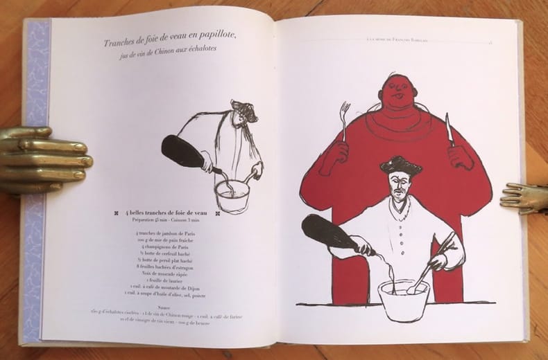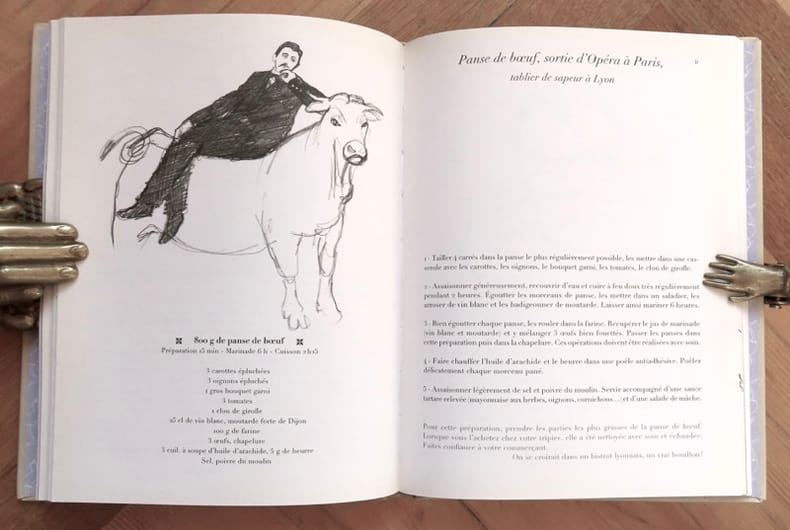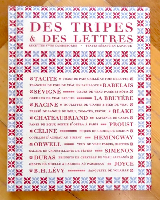 "Un cuisinier, un écrivain et un illustrateur se sont trouvés d'accord pour célébrer ce que l'on appelle communément "les bas morceaux". Yves Camdeborde s'est mis en cuisine, Sébastien Lapaque s'est enfermé dans sa bibliothèque et Michel Tolmer est allé travailler le motif au pavillon de la triperie à Rungis. De cette rencontre entre la fourchette et la plume, entre les fourneaux et la littérature, est né « Des tripes et des lettres » un recueil de 15 recettes, drôle et gourmand, que les bibliophiles pourront honorer d'une reliure en vessie de porc. L'accord se fait naturellement entre les tripes et les lettres. Proposer une série de pastiches tripiers, c'est simplement tenir les deux bouts de la chaîne, vouloir embrasser vingt siècles de gourmandise et de littérature occidentale en posant un pied au temps d'Apicius et l'autre à l'époque de James Joyce."