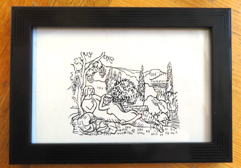 Gravure tirée à la presse à bras par Philippe Gonin, sur les bois d'Aristide Maillol. Dimension du cadre: 17 x 12 cm.