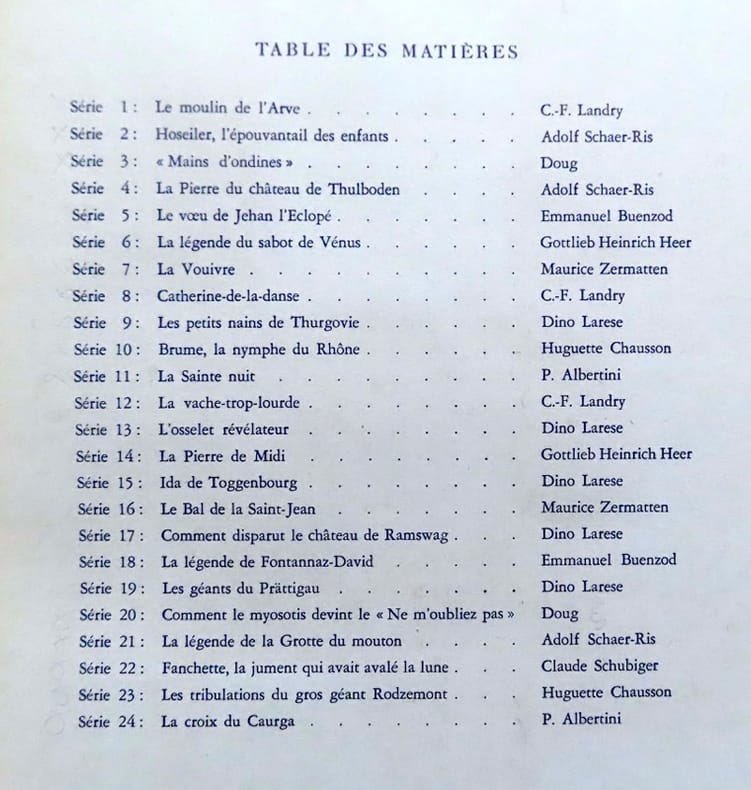 Au sommaire, entre beaucoup d'autres: Elfes et fées du lac de Joux - La fée d'Evolène - Le cheval vert du Tritt, La plus belle fleur du vallon de Dornach,...