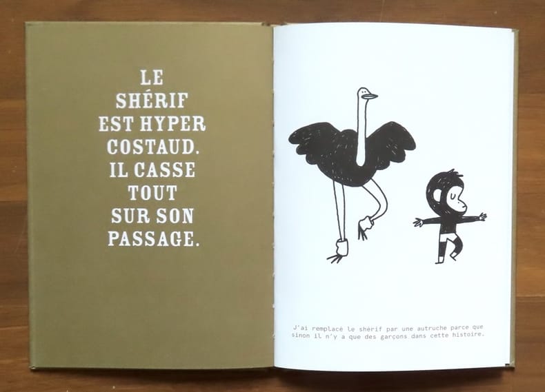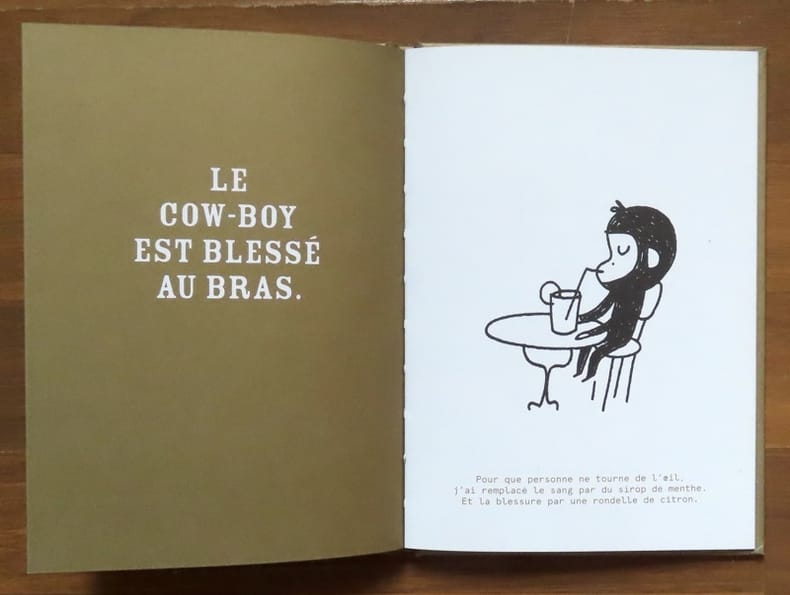 "Ainsi commence cette super histoire de cow-boy : page de gauche, le texte raconte les frasques d'un cow-boy pas très commode, qui mange des bébés lapins, dit des gros mots et cambriole des banques. Page de droite, Delphine Perret corrige, donnant ainsi vie à un singe qui se brosse les dents et fait des séances d'aérobics. Un rapport texte-image absolument hilarant pour ce petit livre détonant, qui tourne en dérision le politiquement correct. Les deux histoires qui se font face donnent lieu à des situations complètement absurdes et jubilatoires." On adore !