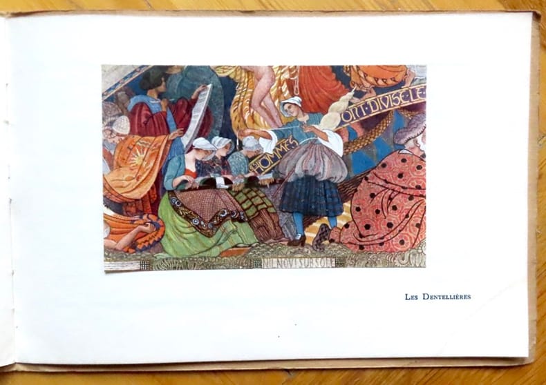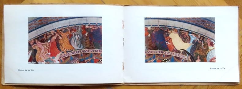 Genève, Atar, [1923]. In-8 broché à l'italienne, vignette couleur contrecollée au premier plat. Auréole au coin inférieur, courant sur tout le volume, couverture légèrement défraîchie. Illustré de 5 détails de cette magnifique fresque, considérée par d'aucuns comme l'une des plus belles du genre en Suisse. Nous pouvons témoigner puisque nous passons devant tous les jours, non sans lever la tête pour l'admirer.