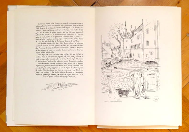 Serrières-Neuchâtel, Chocolat Suchard / Paul Attinger 1952. In-4 en feuilles, chemise cartonnée et décorée à 3 rabats. Infimes défauts au cartonnage. Bien complet de la petite note volante annonçant que cet ouvrage a été classé parmi les plus beaux livres suisses de l'année 1952. Illustré de pointes-sèches lithographiques de Marcel North.