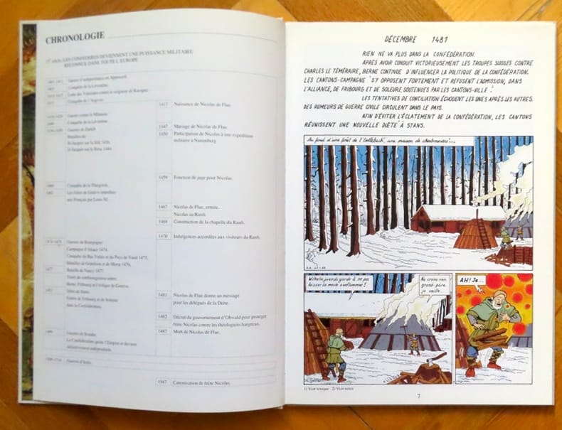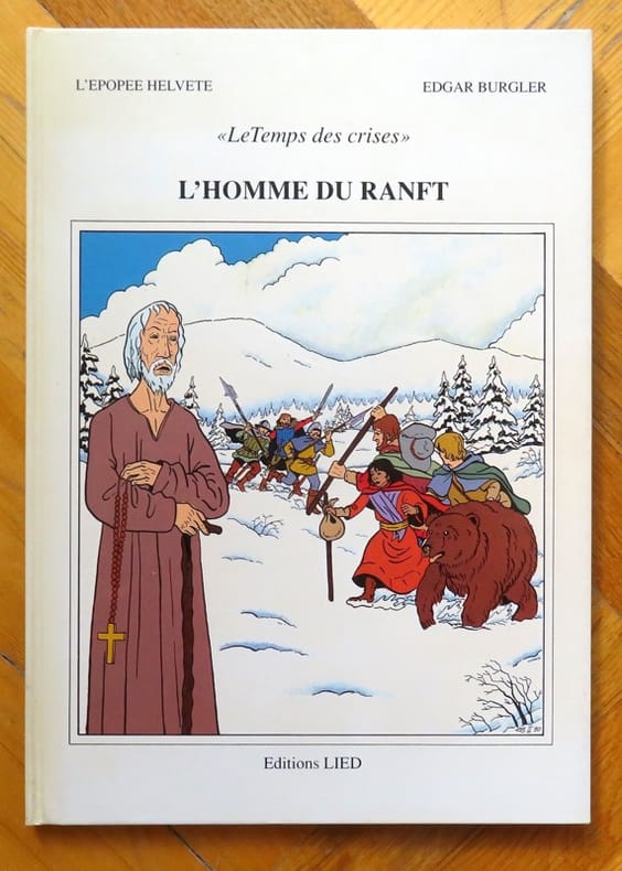 Rare ensemble, complet en 5 volumes, de cette épopée en bande dessinée, se terminant par des dossiers pédagogiques illustrés. Le premier volume démarre en -58 (la conquête romaine, Divico et César) et l'on découvre au fil des tomes la fin de l'Helvétie romaine (259-260 après J.C.), la bataille de Morgarten (15 novembre 1315), Nicolas de Flüe et enfin la Réforme.