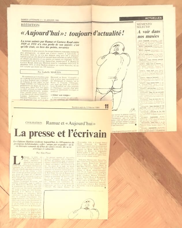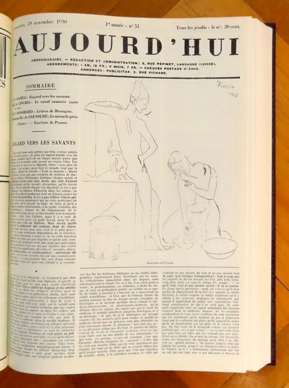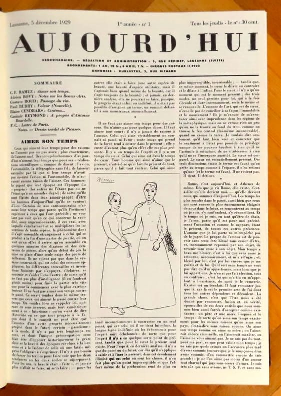 Fac-similé de la collection complète de l'hebdomadaire édité par Henry-Louis Mermod, dirigé par Ramuz et dont Gustave Roud était le secrétaire de rédaction. L'hebdomadaire compta 109 numéros, puis la revue devient mensuelle. Illustré en noir de photographies, fac-similés et dessins de Cocteau, Picasso, Auberjonois, Matisse et bien d'autres. Une grande page de l'histoire littéraire et artistique romande, qui traitait de l'actualité (d'où son titre) à travers le regard des artistes. On joint 2 articles de presse (Isabelle Martin et Alec Plaut), relatifs à ce bel ouvrage.