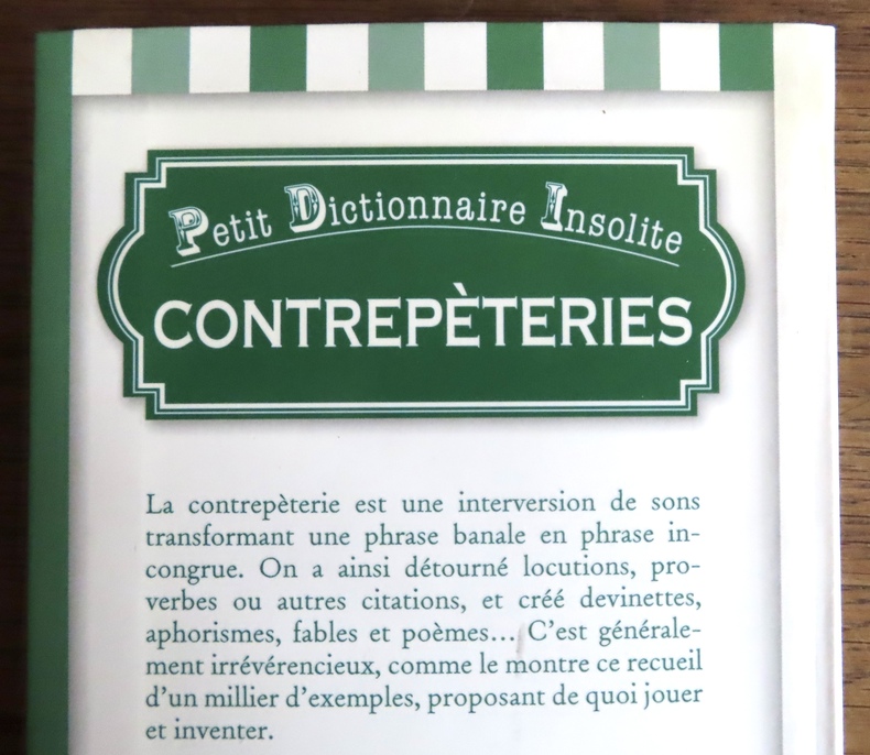 Une préface explique ce qu'est la contrepèterie. Un classement par rubriques et par thèmes : présentation des précurseurs de genre et leurs contrepèteries. Des contrepèteries sous forme de devinettes (à trouver donc), de fables - Des issues de l'album de la Comtesse, contrepèteries pour les enfants, au fil des rubriques des encadrés contenant des contrepèteries d'auteurs célèbres (Rabelais, Hugo, Boris Vian, Desnos, Prévert, etc.). Oeuvres brouillées : L'Apéro de quatre saouls (Brecht), La Charmeuse de pâtres (Stendhal), etc. Un lexique (contrepèteries de A à Z).