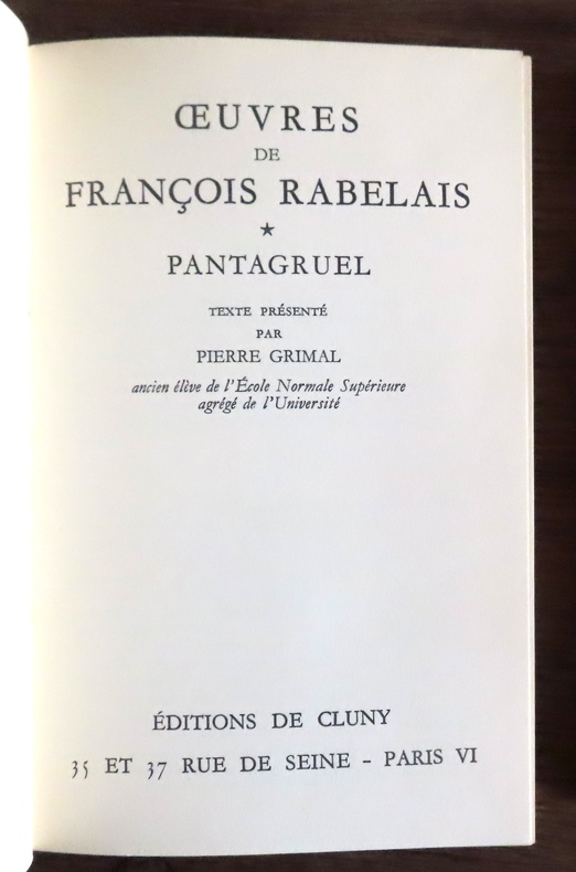 SOMMAIRE : Tome I : Pantagruel, Tome II : Gargantua, Tome III : Le Tiers livres, Tome IV : Le quart livre, 373 pages. Tome V : Cinquième livre, document contemporain, bibliographie, commentaires / François Rabelais (également connu sous le pseudonyme Alcofribas Nasier, anagramme de François Rabelais, ou bien encore sous celui de Seraphin Calobarsy) est un prêtre catholique français, également médecin et écrivain humaniste de la Renaissance, né à La Devinière à Seuilly, près de Chinon (dans l'ancienne province de Touraine), en 1483 ou 1494 selon les sources, et mort à Paris le 9 avril 1553. Classification Dewey : 840.03-XVI ème siècle