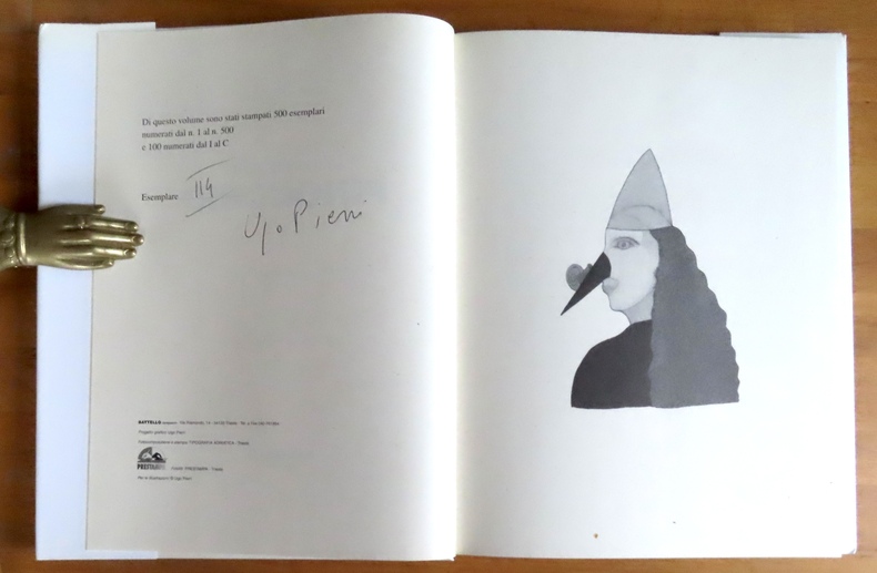 Tirage limité à 600 exemplaires, tous numérotés et signés par l’artiste au justificatif. Notre exemplaire porte le numéro 114, il comporte comme il se doit la signature originale d’Ugo Pierri au justificatif. Belle édition contemporaine de bibliophilie, de grande qualité typographique et iconographique, publiée par Battello Stampatore, maison réputée pour ses livres d’art et tirages soignés.