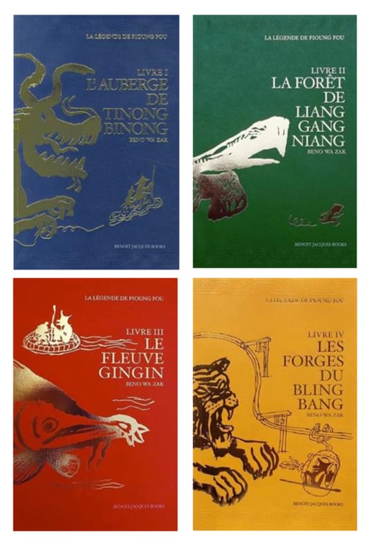 Retrouvez les quatre volumes de la Légende de Pioung. Chaque volume est complet de son bon pour un tour de Kang Gû dans L’Auberge de Tinong Binong, son fac-similé de rouleau de printemps énigmatique autour de La Forêt de Liang Gang Niang, son plan de la forêt dans Le Fleuve Gingin et son coupon de la palachinoise des jeux dans Les Forges du Bling Bang. "On sait peu de choses au sujet de Beno Wa Zak, auteur présumé de cette mystérieuse saga. Il serait également l'auteur de la fameuse fable palachinoise Wa Zo Kong." Dédié aux honorables lecteurs (et lectrices) en mal de lectures aussi désopilantes qu'absurdes: on adore !