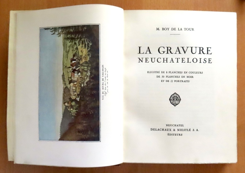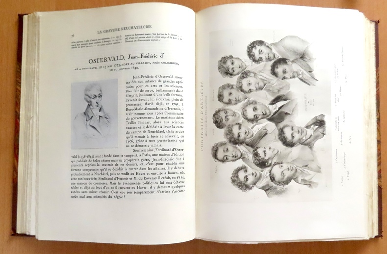 Neuchâtel, Delachaux & Niestlé 1928. Bel exemplaire relié, reliure avec coins, dos orné avec titres dorés, tête dorée, non ébarbé, fort in-4 (28 cm x 22), 284 pages sur beau papier teinté avec préface, portraits sur vignettes contre collées, bibliographie, index des noms de graveurs, index des portraits cités .., index des planches citées, se rapportant au canton de Neuchâtel .., index des ouvrages, table des gravures, des portraits + planches en couleurs et en noir/blanc.