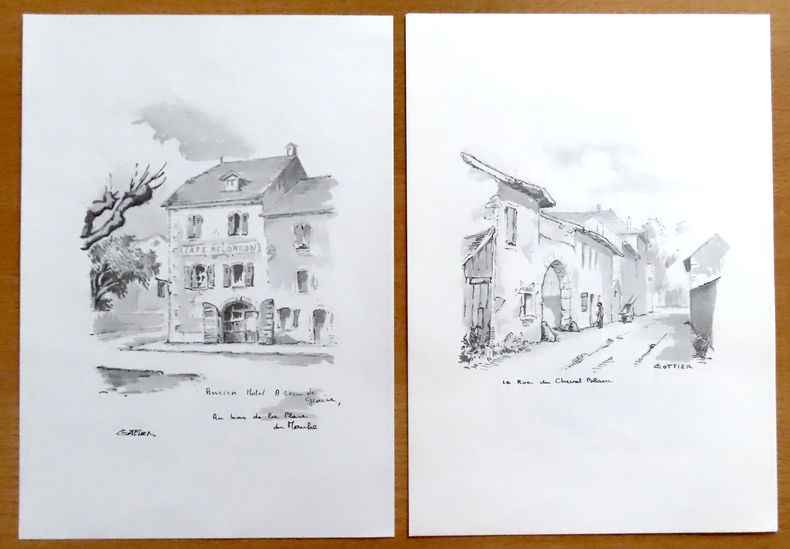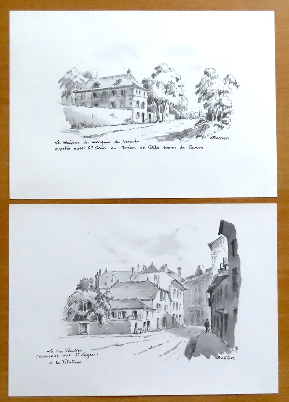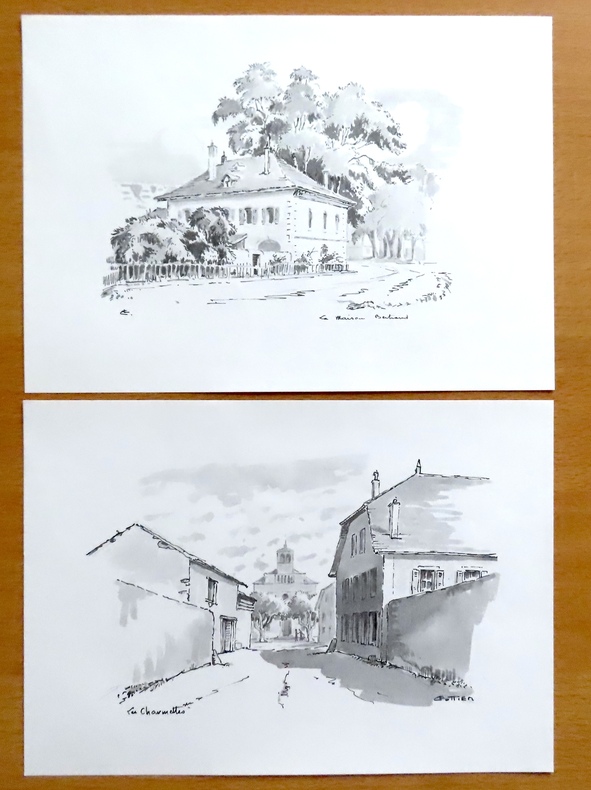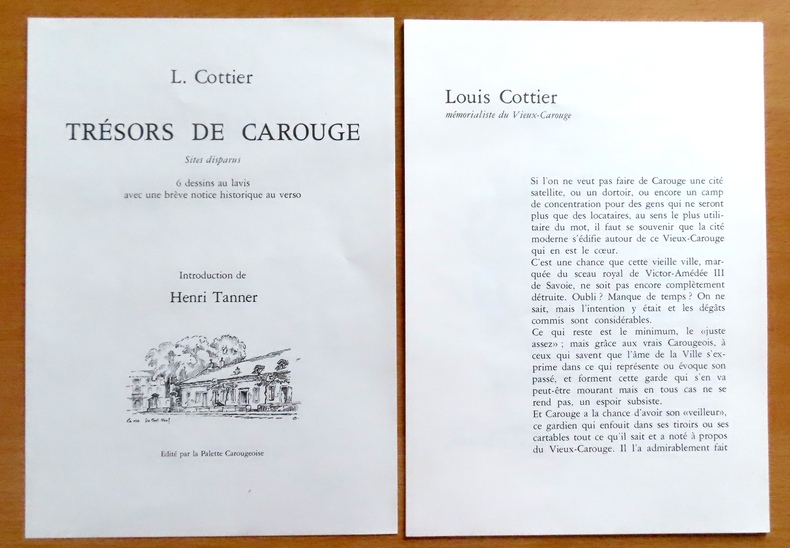 Carouge, La Palette carougeoise, 1963. 6 dessins au lavis avec une brève notice historique au verso, page de titre et page d'introduction - le tout en feuilles, sous chemise illustrée à rabats.