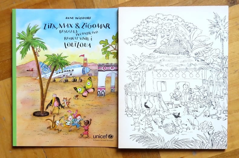 Unicef Schweiz / Suisse / Svizzera, 2008. Leporello in-folio (format fermé de 26 x 32 cm), illustré par Anne Wilsdorf. Renfort de toile à certains plis. Au recto: tout en couleurs, au verso: à colorier !