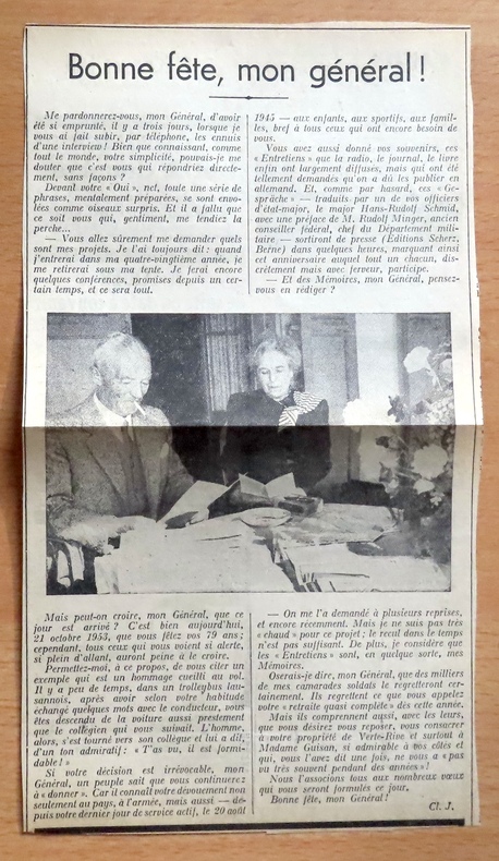 Lausanne, Payot, 1953. In-8 broché, couverture photographique à rabats. Illustré de 27 photographies hors-texte en noir. En belle condition, non coupé. On joint une coupure de presse relative au Général.