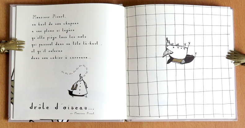 Cet ouvrage rend hommage à deux drôles d'oiseaux partis tout là-haut : Prévert et Doisneau. "Monsieur Pivert a une plume si légère qu'elle piège tous les mots, et Monsieur Moineau prend des photos au piège de sa cage".
