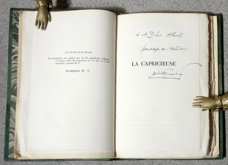 Edition originale au tirage limité à 28 exemplaires sur pur fil Lafuma, celui-ci un des 20 numérotés (6), outre 8 marqués HC. Exemplaire agrémenté d'un envoi autographe signé d'Edmond Jaloux.