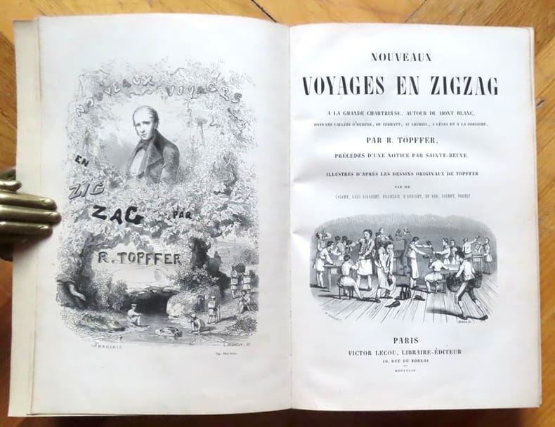 Récits des excursions à travers les Alpes d’une caravane guidée par Töpffer. Contient: ‘Voyage à la grande Chartreuse’ - ‘Voyage autour du Mont-Blanc’ - ‘Voyage à Gênes’. Superbe exemplaire dans un état exceptionnel. Ex. pour bibliophile averti. Perret 4297; Wäber 66, (plusieurs éditions). Image disp.