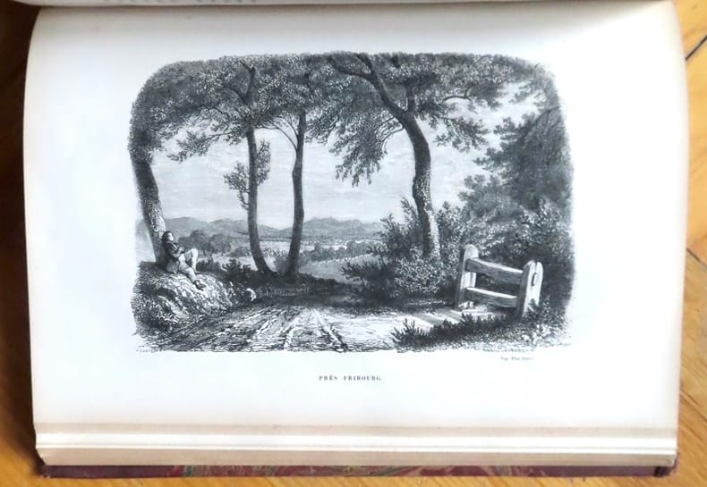 Illustrés d'après les dessins de l'auteur, d'un grand nombre de vignettes dans le texte et de 48 et 54 grandes gravures hors texte, par MM. Calame, Girardet, Français, d'Aubigny, etc., Cinquième et Deuxième éditions, 2 vol. in-4 reliures uniformes de l'époque demi-chagrin vert, dos à 4 nerfs orné (caissons), toutes tranches dorées, rel. signée Ch. Magnier, Garnier frères, 1859 et 1858, 474 et 454 pp.