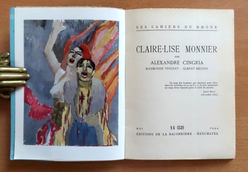 Introduction d’Albert Béguin. Neuchâtel: Editions de La Baconnière (Collection des Cahiers du Rhône, série bleu n°14), mai 1944. Un volume broché (14,3x19,3 cm) sous couverture à rabats, 86 pages non coupées. 9 reproductions des peintures de Claire-Lise Monnier dont une en couleur. Très bon état.