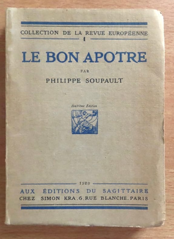 Paris Editions du Sagittaire, "Collection de la Revue Européenne" 1923 1 vol. broché in-16, broché, 218 pp. Edition originale sans mention. On joint 3 lettres adressées par l'auteur en 1923 à Daniel Halévy (dont 2 dactylographiées sur papier à en-tête de la collection de la "Revue Européenne"). Soupault remercie son correspondant de l'intérêt qu'il manifeste à l'égard du "Bon Apôtre" mais il ne pourra pas donner ce roman aux "Cahiers Verts" puisqu'il est déjà engagé au Sagittaire.