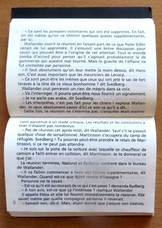 On a testé, ce format révolutionnaire est tout simplement génial, particulièrement dans le tram ou le métro: livre posé sur les genoux, il tient ouvert et les pages cousues et rassemblées par un dos de toile lui donnent une grande souplesse. Hélas, trois fois hélas, ce format a fait long feu :-( Ici: La première enquête du désormais célèbre Kurt Wallander.