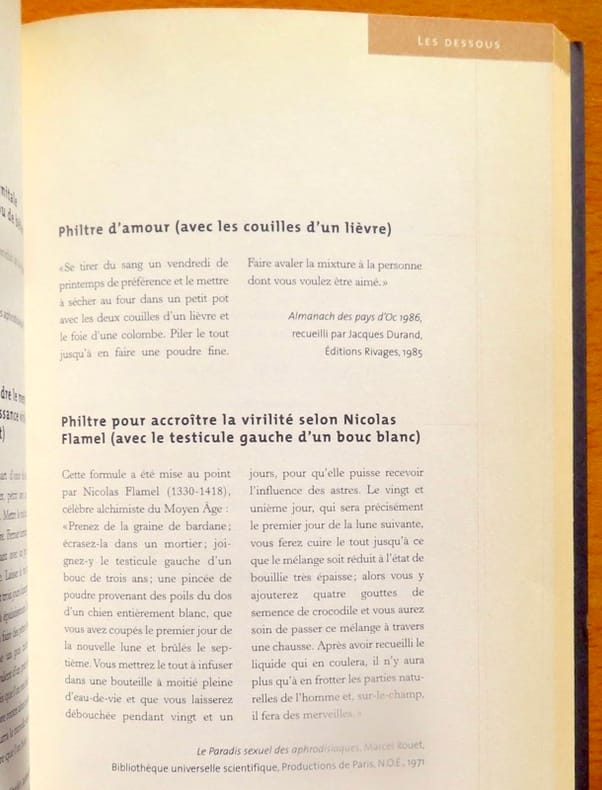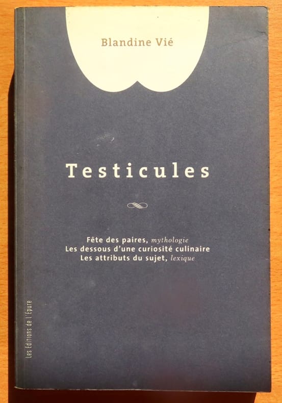 " Comme l'écrivait si savoureusement François Vatable Brouard (1556-1626) à l'aube du XVIIe siècle, sous le pseudonyme de François Béroalde de Verville " On ne fait non plus cas des pauvres que de couilles, on les laisse à la porte, jamais n'entrent. " Dans les livres de cuisine non plus, les couilles n'entrent guère, et pourtant elles firent les délices de la cuisine de cour sous Louis XV, furent un hors-d'œuvre friand de la cuisine classique et bourgeoise au XIXe siècle, et l'un des mets canailles préférés des professionnels de la viande à la Villette, à la grande époque des Abattoirs. Il m'a donc semblé que c'était un devoir de mémoire de leur rendre hommage en collectant les recettes qui les mettent en scène. Puis finalement, de leur rendre hommage tout court, à celles qu'on apprête pour les déguster... et à celles qu'on déguste sans apprêt ! Mon livre se présente donc comme un recueil de gourmandises. en tout genre ou piocher aussi bien des nourritures pour la bouche que des nourritures pour l'esprit. Une leçon de "choses" en quelque sorte. Les mots saveur et savoir ayant. la même filiation étymologique - puisque saveur ("qualité perçue par le sens du goût") vient du verbe latin sapere, qui a d'abord voulu dire "avoir du goût, exhaler une odeur, sentir par le sens du goût", avant de signifier, de manière plus figurée, "avoir de l'intelligence, du jugement, connaître, comprendre, avoir la connaissance" -, ce compagnonnage m'a paru aller de soi. Une manière comme une autre de faire d'une pierre deux coups... ou plus exactement d'une paire deux couilles !" Blandine Vié.