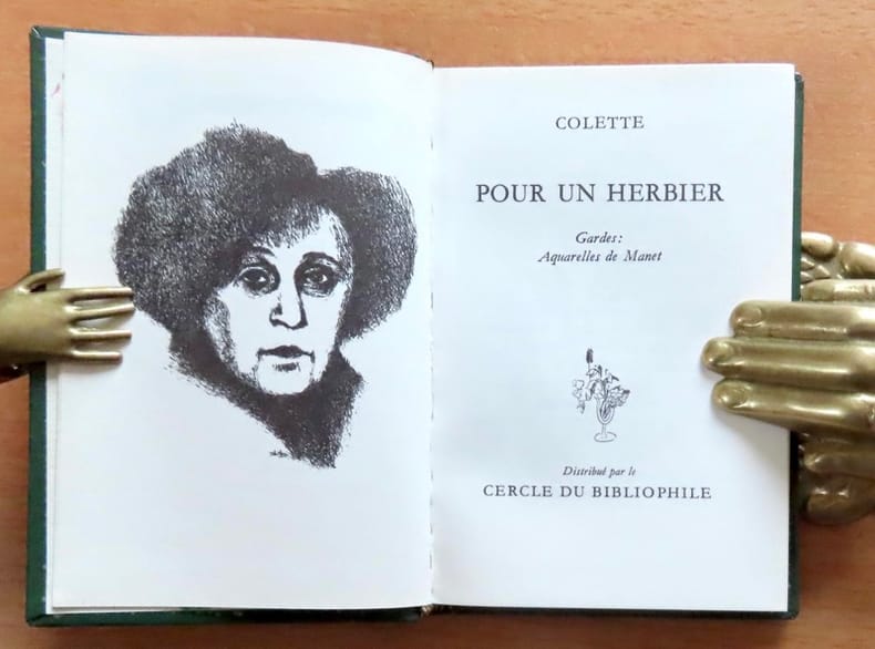 Genève, Edito-Service / Le Cercle du bibliophile, sans date. Tout petit volume (8 x 11 cm.), plein skyvertex décoré. Illustré d'un portrait de Colette en frontispice. Gardes illustrées d'aquarelles de Manet.