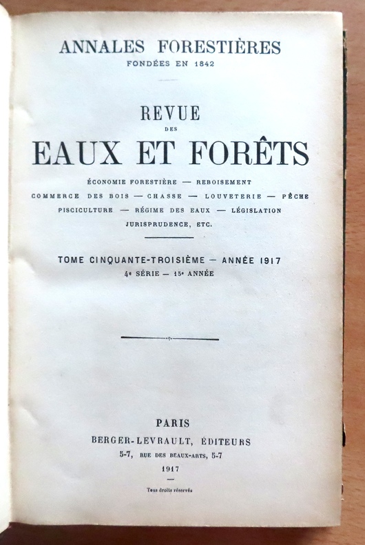Paris, Annales forestières / Berger-Levrault, 1917. Grand in-8 de 384 pages, demi-chagrin, dos à 5 nerfs orné de fleurons et du titre dorés, uniformément passé. Reliure frottée en bords.