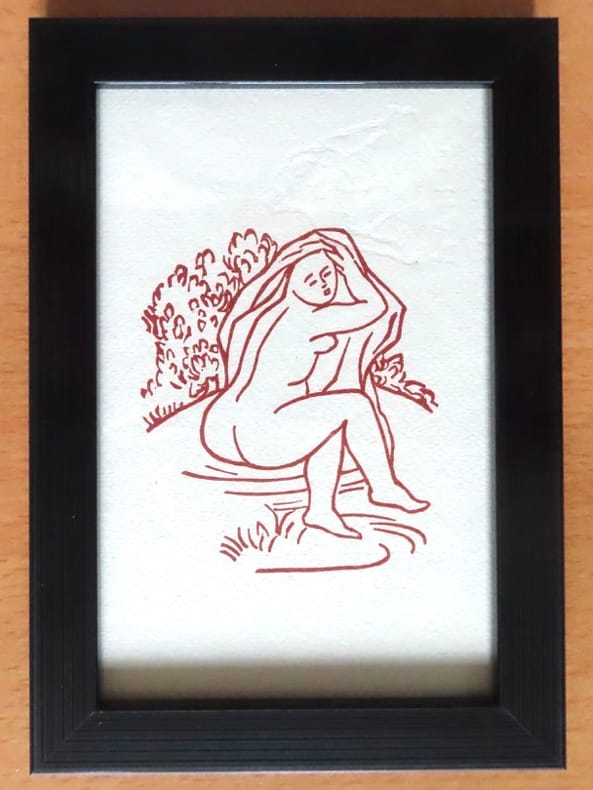 Gravure en sépia, tirée à la presse à bras par Philippe Gonin, sur les bois d'Aristide Maillol. Dimension du cadre: 12 x 17 cm.
