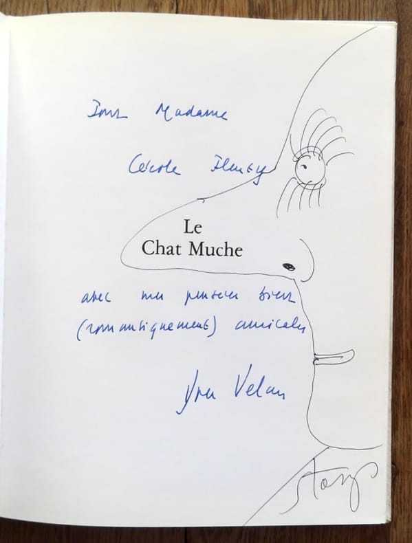 Saviez-vous que Yves Velan avait écrit pour la jeunesse ? Voici voilà... Notre exemplaire est agrémenté d'un dessin (dont ne peut affirmer qu'il soit de l'illustrateur) et d'un envoi autographe signé de Yves Velan, le pompom.