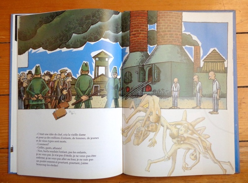 L'histoire d'un petit garçon avec mèche et moustache qui va rencontrer une survivante des camps de concentration. Dédié à une amie de l'auteur qui en est revenue.