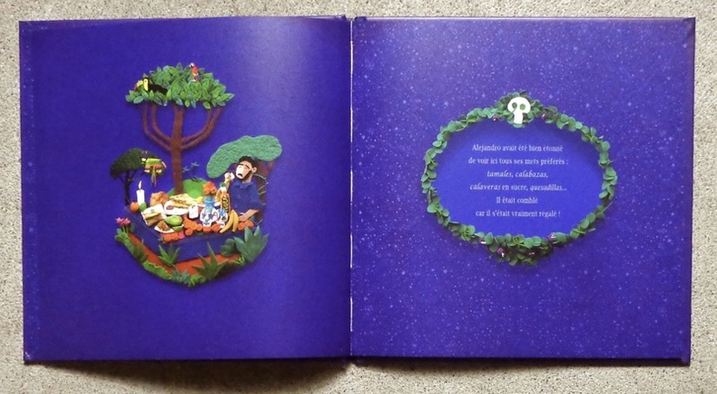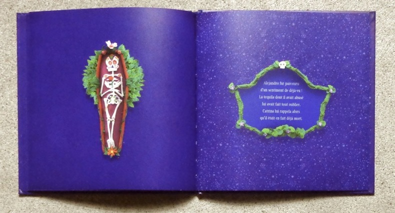 Alejandro rentrant chez lui après un bon repas, rencontre au coin d'une rue une femme pour le moins... squelettique. Jeune illustrateur voyageur, Mickaël Soutif nous propose une immersion au plus près des cérémonies de la fête des morts au Mexique grâce à ses fresques en pâte à modeler aux couleurs vives et d'une extrême précision. Fort de ce prétexte ethnologique, il nous raconte une histoire toute en rimes légères, habile prétexte à évoquer la mort d'un point de vue parfaitement original. Ici, pas de deuil en cinq ou sept étapes, pas d'évocation pudique, tolérante syncrétique d'un hypothétique "après", pas d'incitation à l'entretien de souvenirs supposés combler désormais l'absence car, il l'a très bien compris lors de son voyage au Mexique, "nous allons tous mourir alors pourquoi ne pas plutôt en rire".