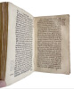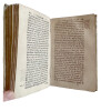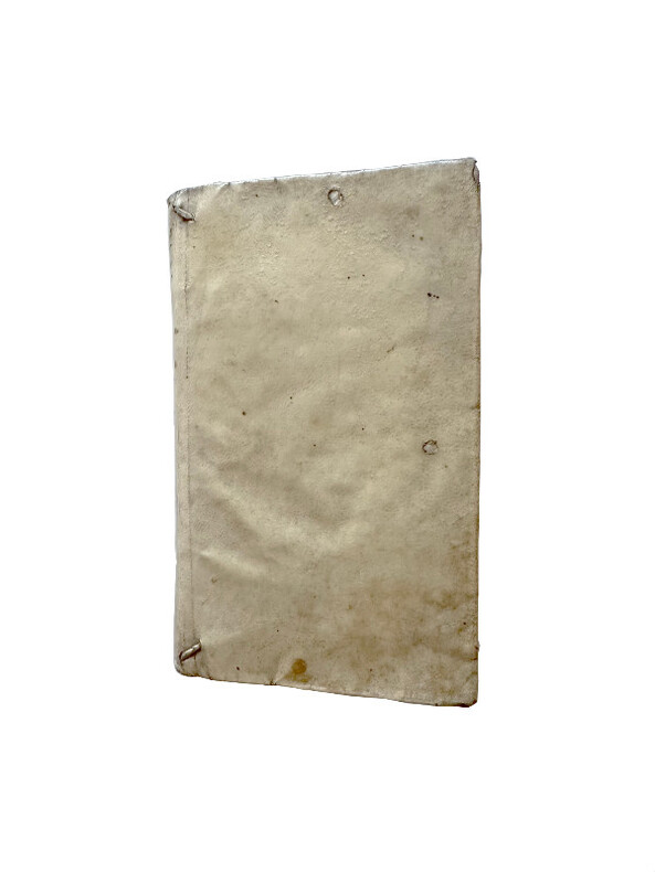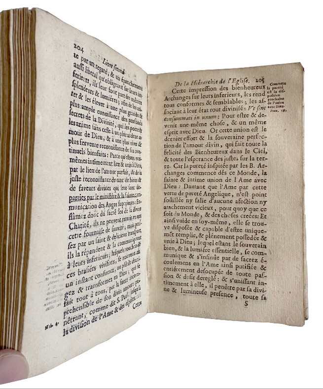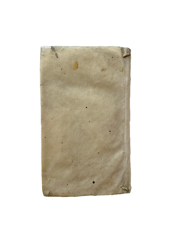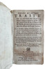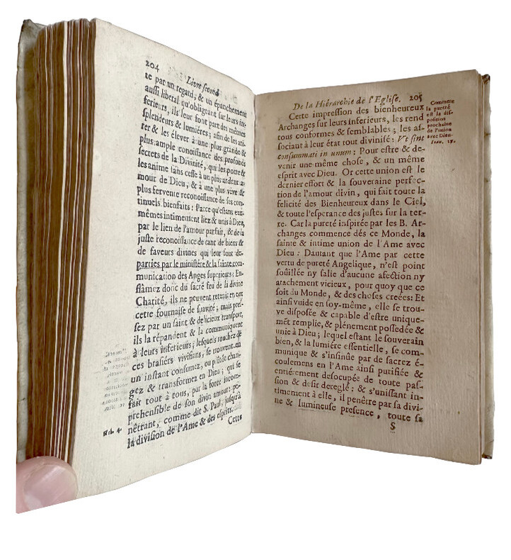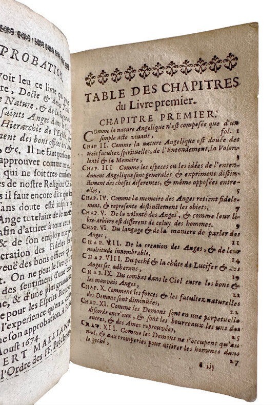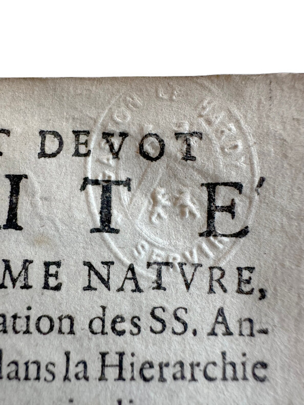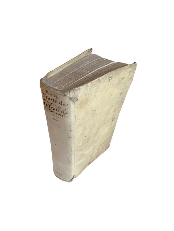 (Un extraordinaire et très curieux traité du XVII siècle sur les Anges et sur les Anges Gardiens. Une rarissime édition originale, conservée dans son vélin souple du temps) DE SAINTE GENEVIEVE Jean (Dom). "DOCTE ET DEVOT TRAITE DE LA SUBLIME NATURE & DE LA DIGNE OCUPATION DES S.S. ANGES, DANS LE CIEL, & DANS LA HIERARCHIE DE L'EGLISE; & ENCOR PARTICULIEREMENT DES BONS OFFICES DE L'ANGE GARDIEN...". 1675, Paris, Vve Iean Henault, & François Henault. 3 livres en 1 volume in-12° (152x95 mm) (dimensions pages 146x85 mm) (12) ff. (titre, oraison, dédicace, avertissement, approbation, tables), 495 pp., (10) pp. (table), (1) p. b. (a6, c6, A-S6, T2, *6, V4, X-Z6, Aa-Xx6) Reliure strictement de l'époque en vélin souple avec titre manuscrit sur le dos. Edition Originale et Unique, rarissime. Très probablement imprimé à petit nombre d'exemplaires. Petite tache claire d'encre sur le titre, sinon superbe exemplaire frais et conservé dans sa toute première reliure du temps. Un extraordinaire livre sur les Anges, leur nature, leur hierarchie, leur mission pour Dieu et auprès des hommes et sur les Anges Gardiens. "La nature angelique est si noble, si excellente, & si pure, qu'elle est toute spirituelle, & incoruptible : n'estant composée, que d'un pur acte vivant, qui n'est en soy, autre chose qu'un simple être actuel, ou, comme disent les Philosophes, une forme essentielle jointe à sa subsistance, qui termine la nature, & rend la personne de chaque Ange, distincte & séparée, des autres particulières qui ont la même nature". (...) "... mais ce manque de pénetration vient de l'imperfection de nôtre Nature : laquelle estant composée de corps & d'esprit, il nous est impossible de nous figurer, & encore moins de voir ou de regarder fixement, une chose purement spirituelle (comme est l'Ange en sa personne, & en sa nature) sinon par la pointe de nôtre esprit, & par la force du raisonnement necessaire, pour former l'idée, & ouvrir un pléne & parfaite conoissance d'une chose". "... la langue des Anges est plus sublime & parfaite, qu'elle est plus simple, & plus nette, faisant voir les choses immédiatement dans leurs propres espéces intentionneles, & purement spirituelles, par la seule direction de la volonté". Sur l'auteur, Jean de Sainte Geneviève, aucune information trouvée, sauf qu'il est l'auteur d'une "Science des Saints..." de 1668. Trés probablement il a été réligieux au couvent des Feuillants situé dans la rue Saint-Honoré à Paris. Apparemment seulement deux exemplaires dans les collections publiques françaises (Amiens et Lyon). Provenance : Un cachet ex libris de Gaston Le Hardy (1833-19..), historien et écrivain normand. Il a écrit, entre autres, une "Histoire de Nazareth et de ses sanctuaires" (1905). (LCPCREL-0015)