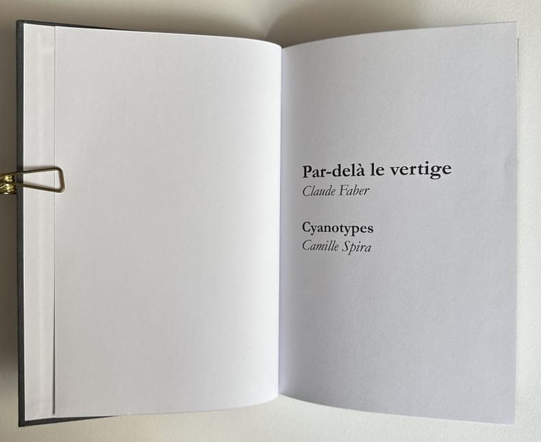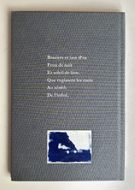 Emboîtage pleine toile grise, imprimée et ornée de vignettes collées en plein, reproduisant des cyanotypes monochromes bleus. Un envoi de l'auteur au premier feuillet blanc. Exemplaire complet, en parfait état. ISBN : 978-2-95650972-1.