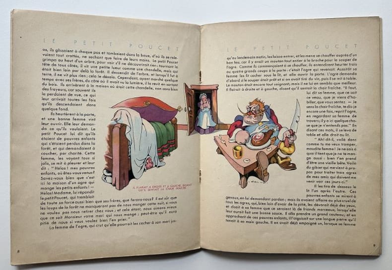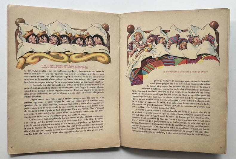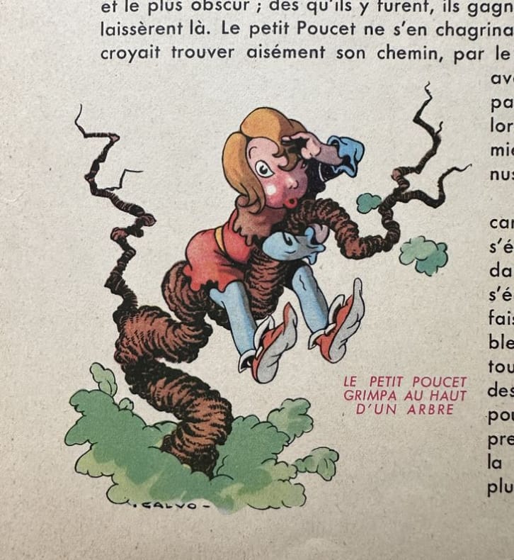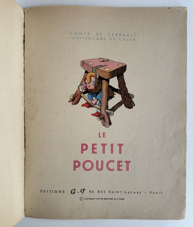 Paris, Editions G. P., 1 vol. (26,9 x 20,9 cm) de 16 p. dont la page de titre et un "achevé d'imprimer en septembre 1947 sur les presses de M. Déchaux". Sur papier velin, assez fort, mat. Superbes illustrations composées dans le texte sur chacune des pages. Edition originale. Edmond-François Calvo, dit Calvo (1892-1957) : français, dessinateur et scénariste de bande dessinée, caricaturiste de presse et illustrateur.Charles Perrault (1628-1703) : auteur.