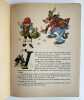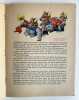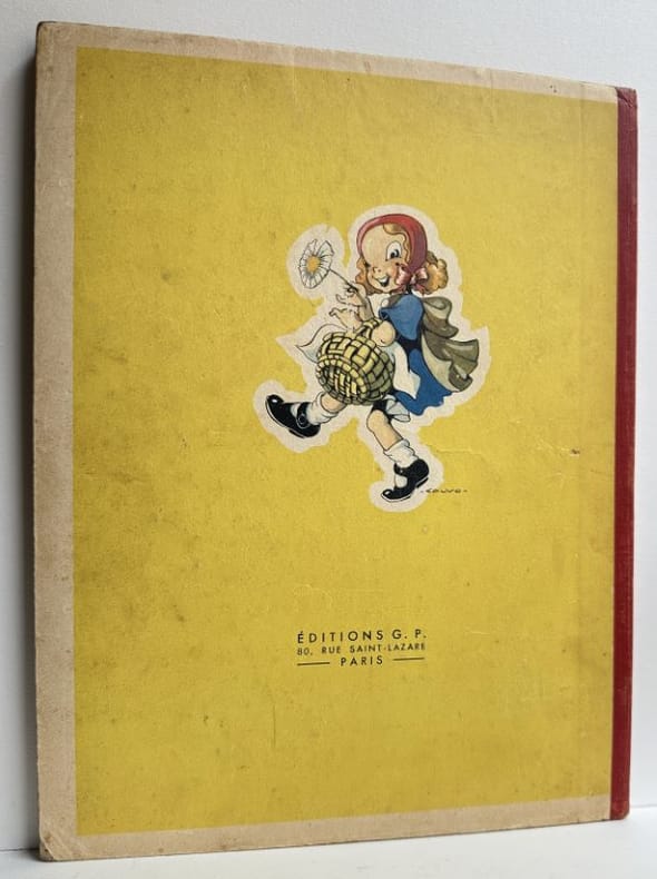 Broché à cahier unique agrafé, dos de papier toilé rouges, plats de carton fin couverts de papier imprimé. Exemplaire complet ; feuillets propres, papier bien conservé et sans inscription manuscrite. En couverture, petits plis discrets, usure périphérique notamment au coin inférieur droit et traces de doigts, tout cela sans excès gardant à l'album toute sa beauté. Un petit accroc dans le papier imprimé au plat inférieur. Les illustrations présentent de belles couleurs puissantes et fraîches. Les mises en page sont toujours inventives et soignées. Bel exemplaire de cet album en édition originale.