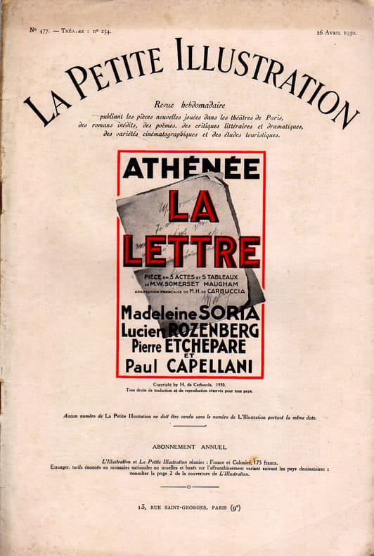 Périodique. Créée en 1929 au théâtre de l'Athénée. L'Illustration (Collection : Théâtre), 20 avril 1930.