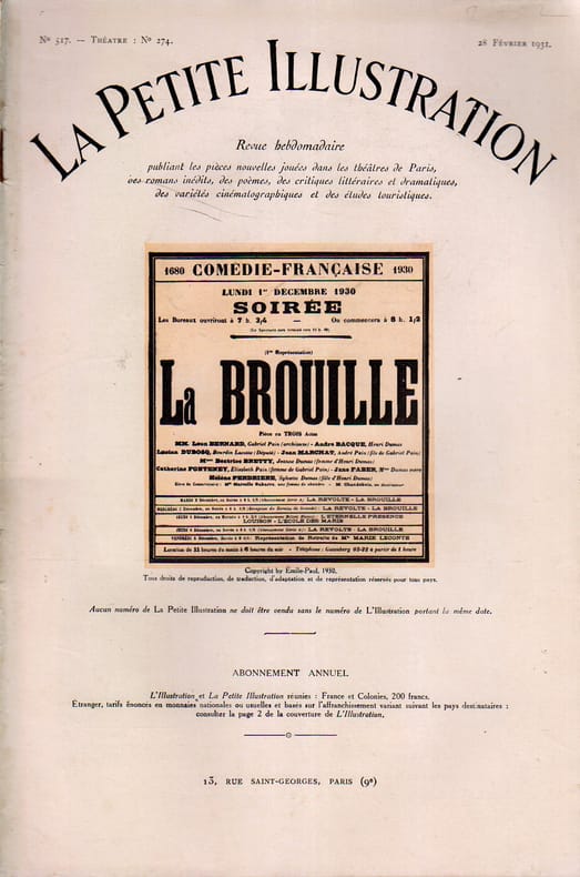 Périodique. Créée en 1930 à la Comédie Française. L'Illustration (Collection : Théâtre), 28 février 1931.