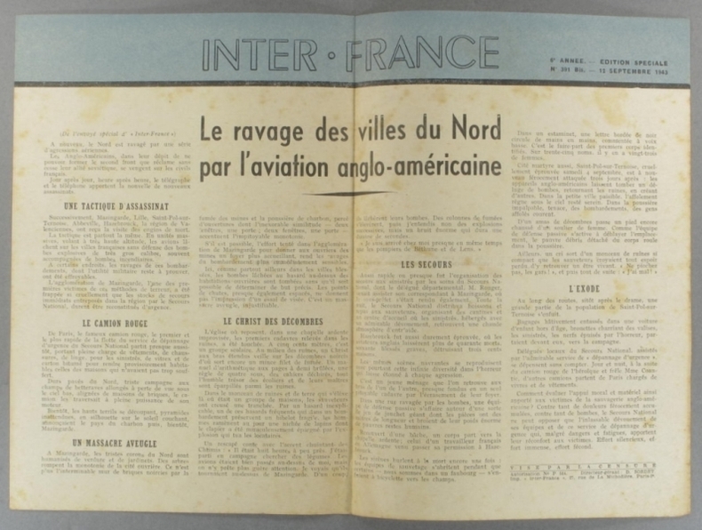 Vieux papier. Une feuille 26 x 35 cm, imprimée recto seul. Directeur-gérant : Dominique Sordet. Inter-France, 12 septembre 1943.