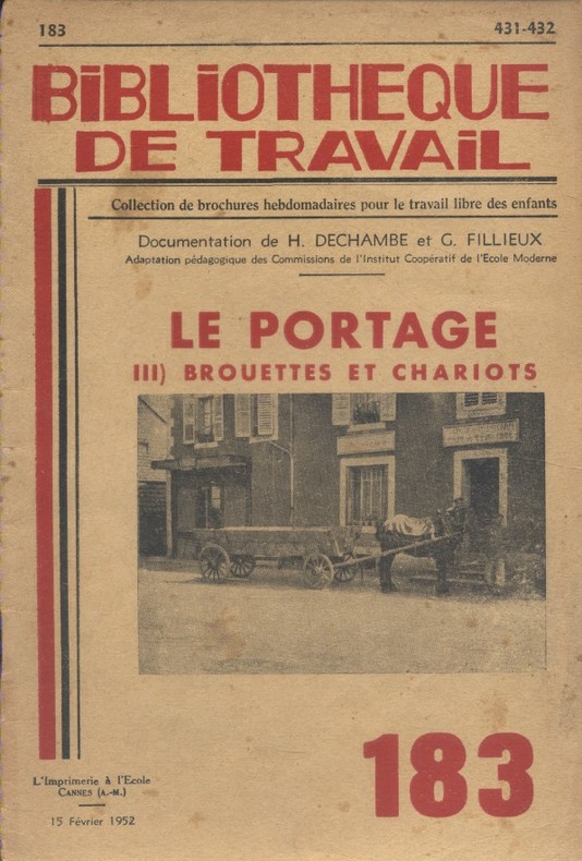 Livre. Collection de brochures hebdomadaires pour le travail libre des enfants. Documentation de G. Fillieux et H. Dechambe. Adaptation pédagogique des commissions de l'Institut Coopératif de l'Ecole Moderne. L'imprimerie à l'école (Collection : BT N° 183), Cannes, Février 1952.