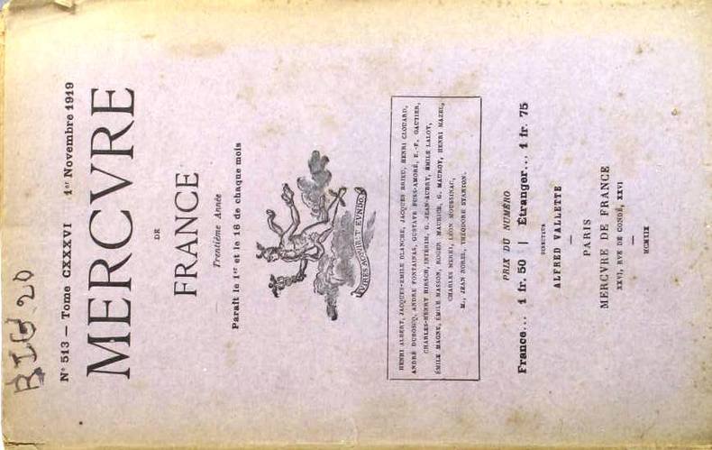 Périodique. Chroniques de André Fontainas, Emile Masson, Charles-Henry Hirsch… Mercure de France, 1er novembre 1919.