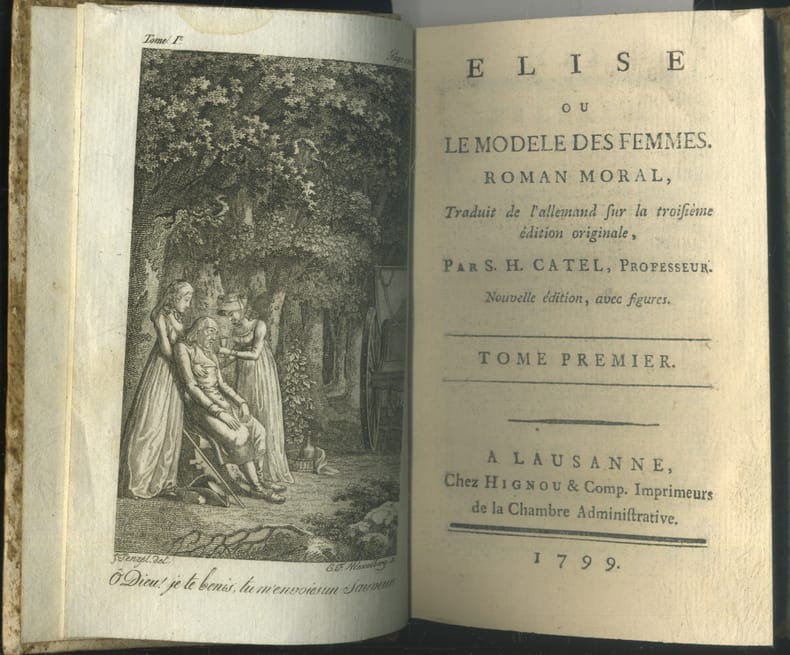 Livre. Nouvelle édition avec figures. (Un frontispice). Roman moral traduit de l’allemand sur la troisième édition originale par S.H. Castel. Chez Hignou, imprimeur, Lausanne, 1799.