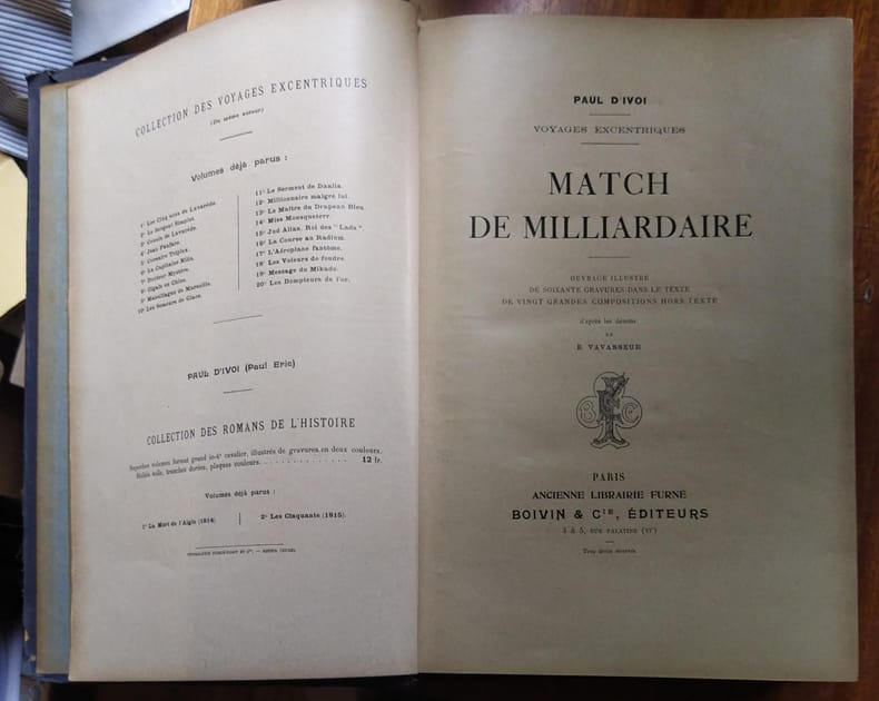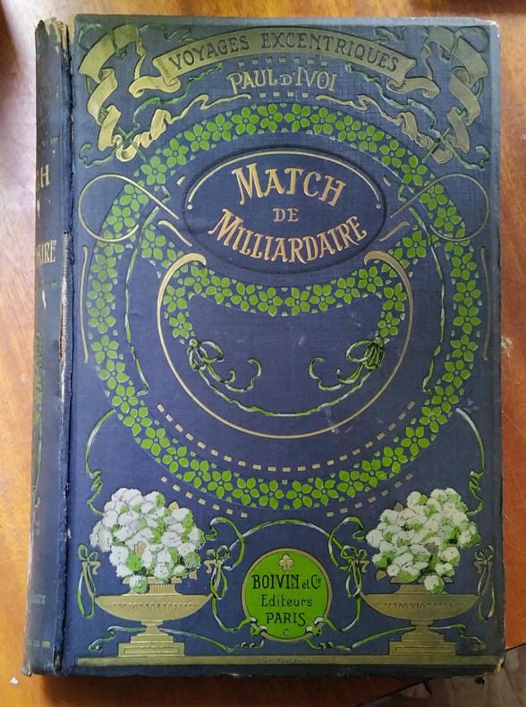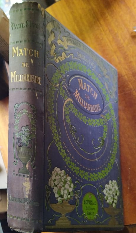 Boivin et Cie - Ancienne Librairie Furne 22 x 31 Paris In-8, s.d. [circa 1920], cartonnage polychrome de l'éditeur sur fond bleu aux guirlandes et vasques de fleurs (Engel rel. - E. Vavasseur del. - Schmitt sc.), dos lisse décoré, auteur et titre dorés, plats biseautés, tête dorée, 428 pp. Ouvrage illustré de soixante gravures dans le texte, de vingt grandes compositions hors texte d'après les dessins de E. Vavasseur. Collection des "Voyages excentriques". Dernier ouvrage de Paul d'Ivoi, alias Paul Deleutre (1856-1915), dont la première édition au cartonnage rouge date de 1914 et qui illustre le succès du roman d'aventures et d'anticipation scientifique au tournant du XIXe siècle, initiée par Jules Verne. La collection des "Voyages excentriques" compte 21 romans, édités par la librairie Furne, dont le fond fut racheté par Léon Boivin en 1906. Le cartonnage, très frais, est dans un excellent état. Papier légèrement jauni. Très bel exemplaire.(RiB31) PHOTOS NUMERIQUES DISPONIBLES PAR EMAIL SUR SIMPLE DEMANDE-DIGITAL PHOTOGRAPS MAY BE AVAILABLE ON REQUEST