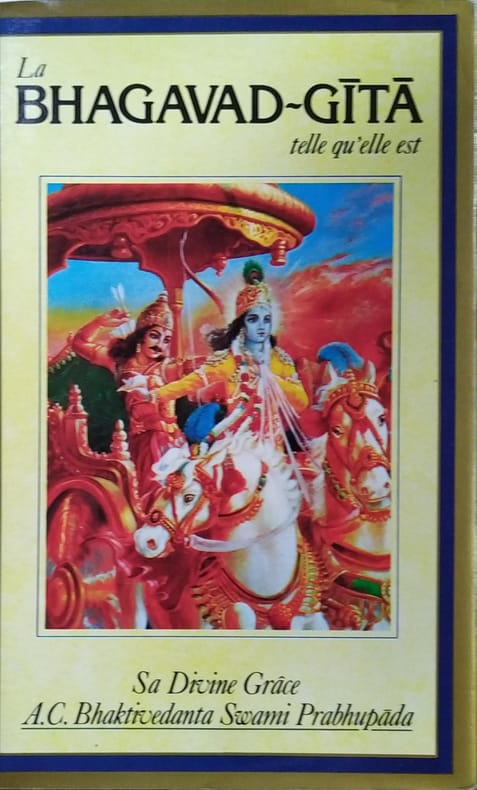 24 planches hors-texte d'illustrations en couleurs 2eme édition corrigée, 1977 "Contents, Chapitres : Biographie de A.C. Bhaktivedanta Swami Prabhupada, Introduction, situation de la Bhagavad-gita, xxxiv, Texte, 391 pages - Sur le champ de bataille de Kuruksetra - Aperçu de la Bhagavad-gita - Le karma-yoga - Le savoir spirituel et absolu - L'action dans la conscience de Krsna - Le sankhya-yoga - La connaissance de l'absolu - Atteindre l'absolu - Le plus secret des savoirs - Les gloires de l'absolu - La forme universelle - Le service de dévotion - La prakrti, le purusa et la conscience - Les trois gunas - La personne suprême - Natures divines et démoniaque - Les branches de la foi - Le parfait renoncement - Appendice : Glossaire et index général - La Bhagavad-Gita ou Bhagavadgita, terme sanskrit se traduisant littéralement par « chant du Bienheureux » ou « Chant du Seigneur ») est la partie centrale du poème épique Mahabharata (Aranyaka-parva, 25 - 42). Ce texte est un des écrits fondamentaux de l'hindouisme souvent considéré comme un « abrégé de toute la doctrine védique ». La Bhagavad-Gita est composée de 18 chapitres. Ce récit n'a cessé d'imprégner la pensée indienne tout au long des siècles. - Les indianistes s'accordent à penser que le texte a été écrit entre le Ve et le IIe siècle av. J.-C., voire au Ier siècle av. J.-C. Selon la légende des groupes Vaishnava, il daterait de 5 000 ans mais selon Anne-Marie Esnoul, « le titre qu'on lui donne fréquemment, Bhagavadgîtopanishad, et la ressemblance qu'elle présente avec les formes upanishadiques a fait se demander s'il ne s'agissait pas primitivement d'une upanishad [...]. Le texte a pu, à l'origine, être moins long ; il n'est pas homogène, il trahit des influences diverses ». La Bhagavad-Gita occupe une place importante dans la pensée religieuse hindouiste : « Sauf dans certains milieux shivaïtes, tous les courants religieux brahmaniques l'ont acceptée comme un livre saint à l'égal des Veda et des upanishad ; on l'a intégrée à la Révélation (shruti) alors que le reste du Mahâbhârata relève seulement de la Tradition (smriti). » - A. C. Bhaktivedanta Swami Prabhupada (Abhay Charan De) est un sannyasi vaisnava de la tradition Brahma Gaudiya Sampradaya (né à Calcutta Bengale de l'ouest (WB) le 1er septembre 1896, mort à Vrindavan le 14 novembre 1977), fondateur de l'Association internationale pour la conscience de Krishna (International Society for Krishna Consciousness, ou ISKCON), mouvement ordinairement désigné sous le nom de « Hare Krishna », emprunté à la moitié du premier verset du « maha mantra », chanté par les dévots vaishnavas se rattachant, à travers lui, à la filiation spirituelle qui le reliait à Chaitanya Mahaprabhu par les maîtres précédents dans l'ordre ascendant, Bhaktisiddhanta Sarasvati Thakura, son maître spirituel, Gaura Kishora das Babaji, Bhaktivinoda thakura, Jagannatha das Babaji, les six Goswamis de Vrindavan. (ibid)" cartonnage propre, intérieur frais et propre, bien complet des 24 planches hors-texte