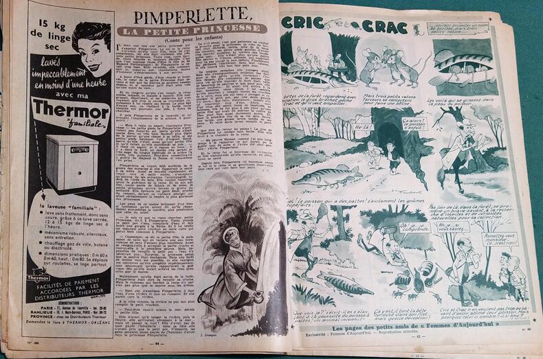 Vieux papier. Pages extraites de Femmes d'Aujourd'hui, du numéro 593 au numéro 615. Contient aussi 2 bandes dessinées incomplètes Mousse et Boule, de Jean Trubert et Fawcett, et le naufragé de la forêt vierge par Henri Vernes et Attanasio. Dessins de Calvo. Femmes d'Aujourd'hui, Vers 1956-1957.
