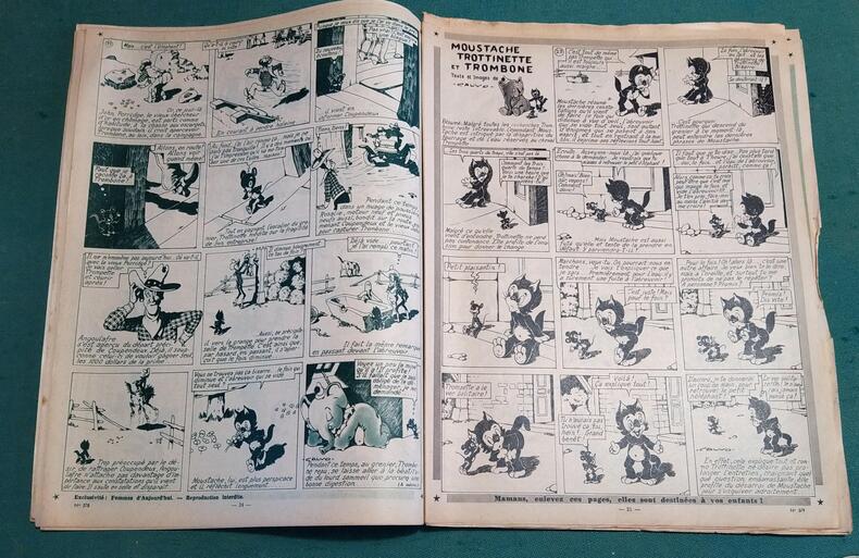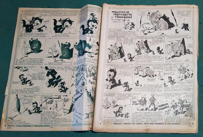 Vieux papier. Pages extraites de Femmes d'Aujourd'hui, du numéro 568 au numéro 591. Contient aussi la bande dessinée incomplète Mousse et Boule, de Jean Trubert et Fawcett. Dessins de Calvo. Femmes d'Aujourd'hui, Vers 1955-1956
