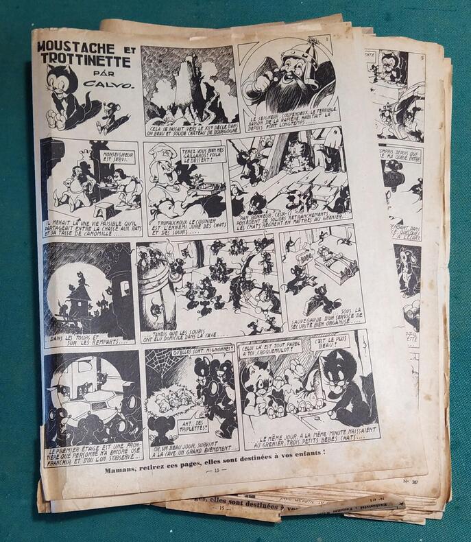 Vieux papier. Pages extraites de Femmes d'Aujourd'hui, du numéro 453 au numéro 492. Contient aussi la bande dessinée Cric et Crac, de Jean Trubert (incomplète). Dessins de Calvo. Femmes d'Aujourd'hui, Vers 1954-1955.
