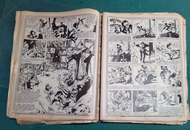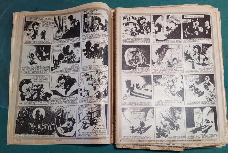Vieux papier. Pages extraites de Femmes d'Aujourd'hui, du numéro 593 au numéro 615. Contient aussi 2 bandes dessinées incomplètes Mousse et Boule, de Jean Trubert et Fawcett, et le naufragé de la forêt vierge par Henri Vernes et Attanasio. Dessins de Calvo. Femmes d'Aujourd'hui, Vers 1956-1957.
