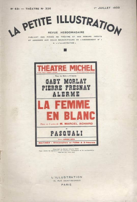 Périodique. Créée en mars 1933 au Théâtre Michel, avec Gaby Morlay et Pierre Fresnay. La Petite Illustration (Collection : Théâtre), 1er juillet 1933.