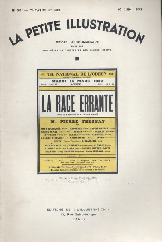 Périodique. Créée en 1932 au théâtre de l'Odéon, avec Pierre Fresnay. La Petite Illustration (Collection : Théâtre), 18 juin 1932.