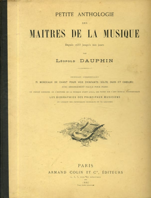 Paris Librairie Armand Colin 1911 in 4 (28x22,5) 1 volume reliure de l'éditeur, plats cartonnés imprimés, dos de percaline noire (titré), 180 pages. Ouvrage comprenant 71 morceaux de chant pour voix d'enfants (solos, duos et choeurs) avec arrangement facile pour piano, un exposé sommaire de l'histoire de la musique avant Lulli, des notes sur l'art musical contemporain, les biographies des principaux musiciens, un lexique des expressions musicales et 50 gravures. Léopold Dauphin, Béziers 1847-1925, compositeur, poète et critique musical français. Nouvelle édition (10ème), mise à jour. Bel exemplaire, très frais ( Photographies sur demande / We can send pictures of this book on simple request )